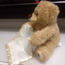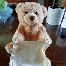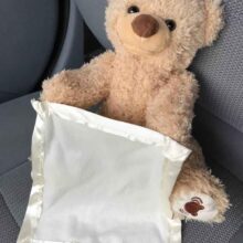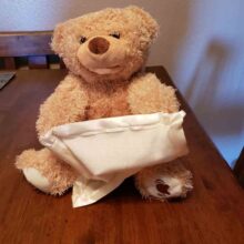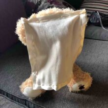 The peek a boo bear was an adorable addition to my 6 month old's collection of stuffed animals. The game of peek a boo is one of her favorites but, she is quite the aggressor LOL. She no longer wished to play the game with the bear and decided she wanted his blanket. Mr. Bear went to cover his eyes and my 6 month snatched his blanket from detaching it from one of his cute unsuspecting paws. It's an easy fix. The voice over is so precious. It would be awesome if there was an option to order the bear with your child's name in place of "baby." I'd definitely order this product for future babies in my family. It's a keeper. Thank you for producing an adorable keepsake!!