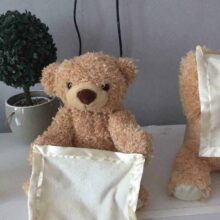 Peek-a-Boo Bear says “I found you!” Press his foot and this sweet honey brown bear will engage your baby in a lively game of peek-a-boo. He moves his furry arms up and down, covering and uncovering his face with his little blanket.