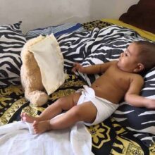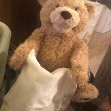 I bought this bear for my 8 mos old granddaughter, but my 2-year-old grandson won’t let her play with it. He loves it so much and is amused with the bear pleating peek-a-boo!