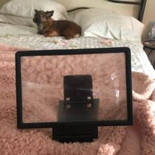 This is a neat gadget to have if you use your phone a lot to watch movies and TV. It’s clear when it magnifies. I have an iPhone 11 Pro Max with a case. I keep the case on (to answer one person’s question). It’s foldable, so it stores easily. I honestly just put it on my chest and watch it while I’m in bed. When I’m done, I fold it up and put it in my night stand. For the price, and to help save your eyes, I recommend this.